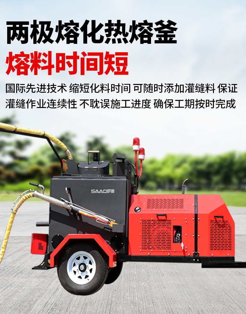 主要功能:通過(guò)一根單獨(dú)的加熱軟管將加熱融化后的橡膠瀝青基密封材料連續(xù)注入清理過(guò)的縫隙完成裂縫病害密封處理。輔助灌縫設(shè)備完成裂縫密封的設(shè)備有(開(kāi)槽機(jī)、熱風(fēng)槍?zhuān)?,密封材料主要是瀝青基橡膠密封膠。