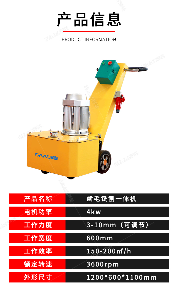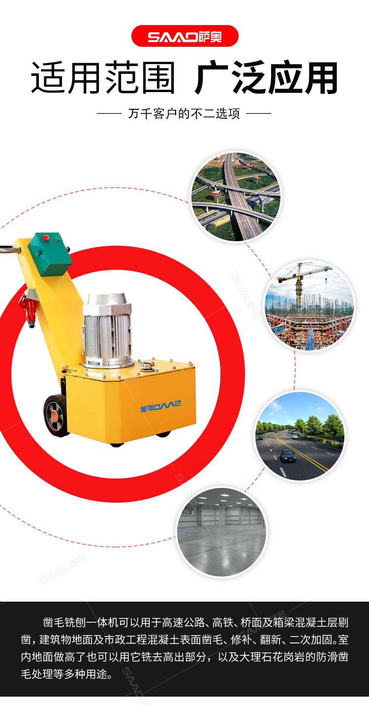 一、產(chǎn)品簡介: 鑿毛銑刨一體機,不需要空壓機,純電動,主要用于高速公路,高鐵,橋面及箱梁混凝土面層剔鑿,建筑物地面及市政工程混凝土表面鑿毛,修補,翻新,二次加固。室