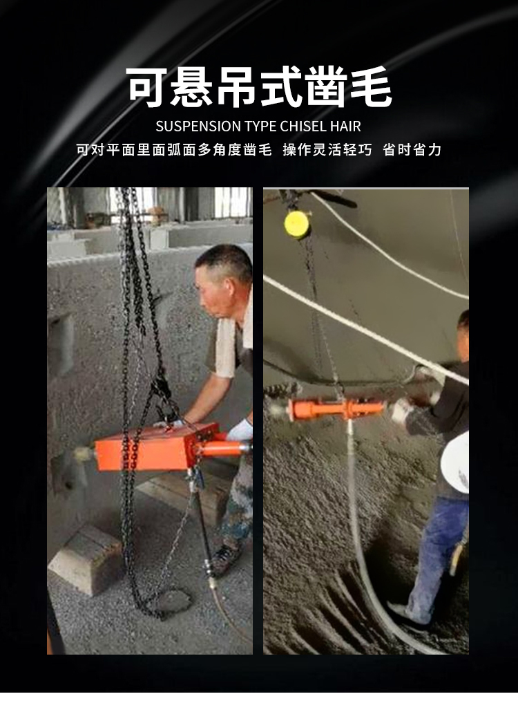 手持式懸掛鑿毛機(jī)機(jī)身有吊環(huán),鑿墻面的話(huà)吊起來(lái)使用,對(duì)平面、立面、弧形等多角度進(jìn)行鑿毛作業(yè),打擊力大、鑿深自如,應(yīng)用領(lǐng)域非常廣泛,又省力還方便。
