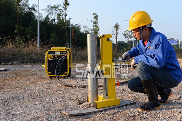 薩奧SAHD-50液壓拔樁機是一款手動操作的輕型拔樁工具。雖然設備自重有限,但卻有強勁的拔樁力。適用于地面上苛刻的拔樁工作。最大每次拔起行程200毫米,可拔任意形狀的木樁和鐵樁。